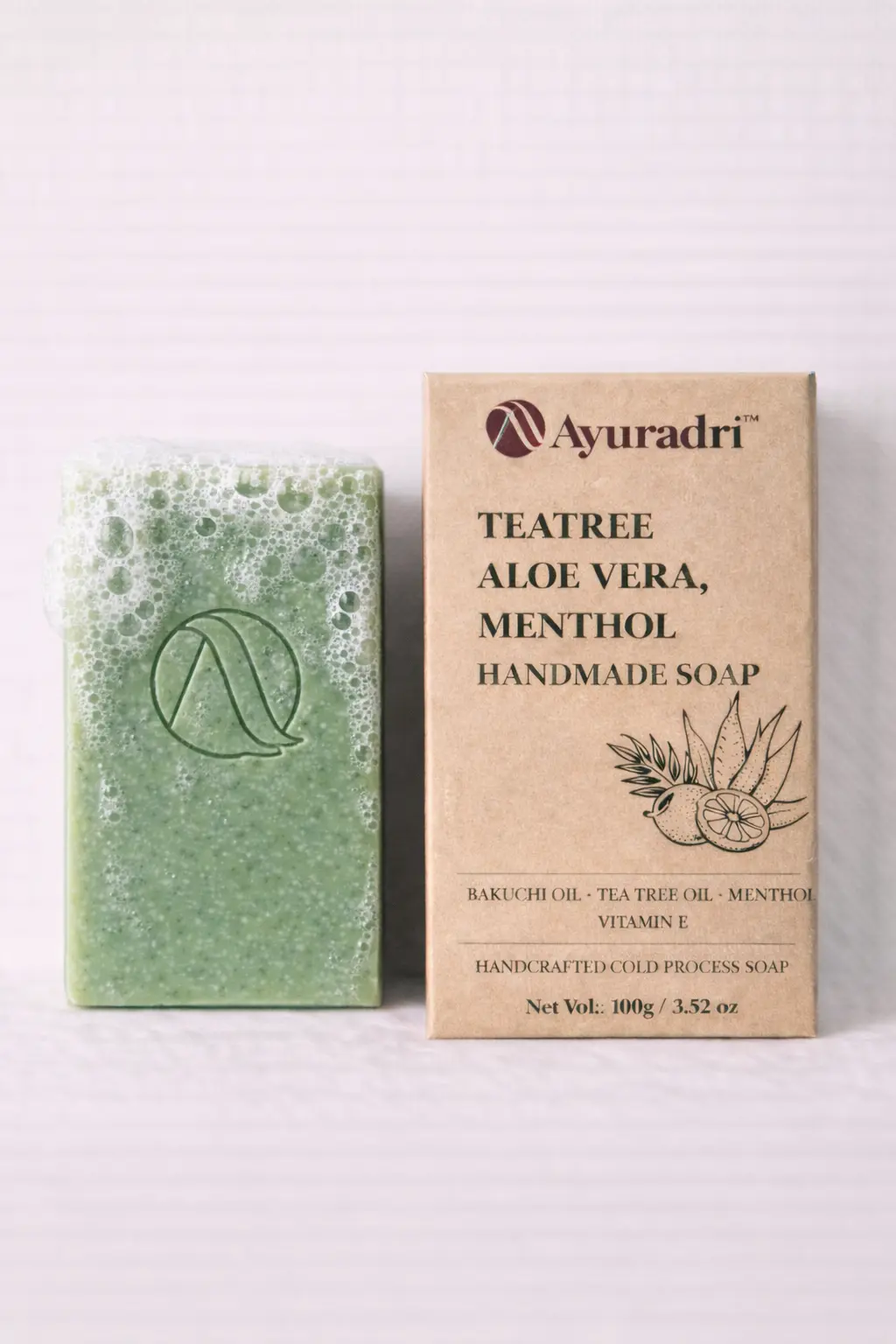 Refresh and revitalize your skin with Ayuradri Tea Tree Aloe Vera Menthol Handmade Soap, a cooling herbal blend crafted using the traditional cold process method to preserve the natural goodness of botanical oils and extracts.Enriched with Aloe Vera Extract and Tea Tree Oil, this soap gently cleanses while helping maintain balanced and healthy-looking skin. Menthol provides a refreshing cooling sensation, making it ideal for warm climates and post-workout cleansing.The nourishing blend of Coconut, Olive, Jojoba, Sunflower, and Castor Oils creates a rich, creamy lather that leaves the skin feeling clean, refreshed, and comfortably hydrated.